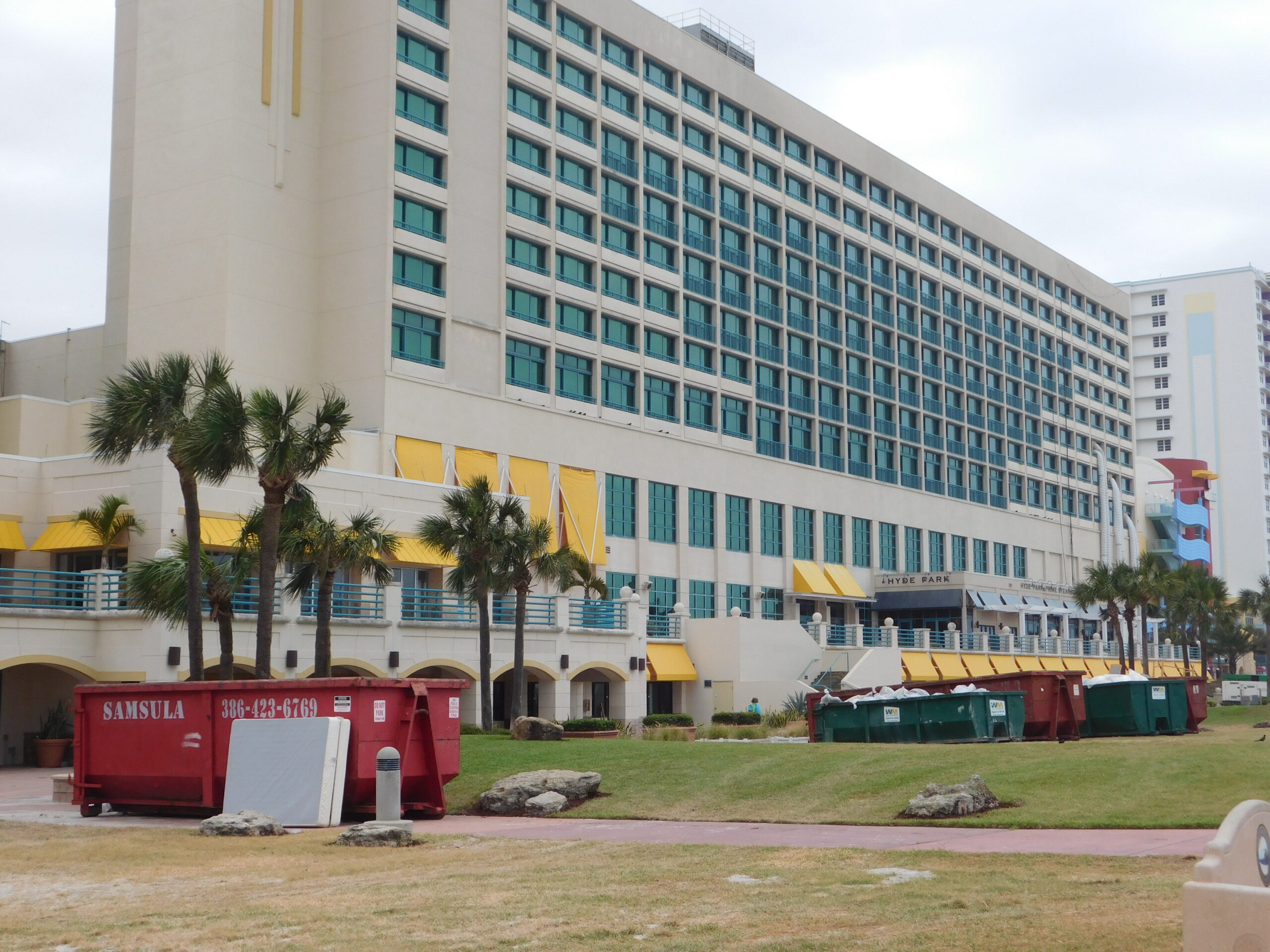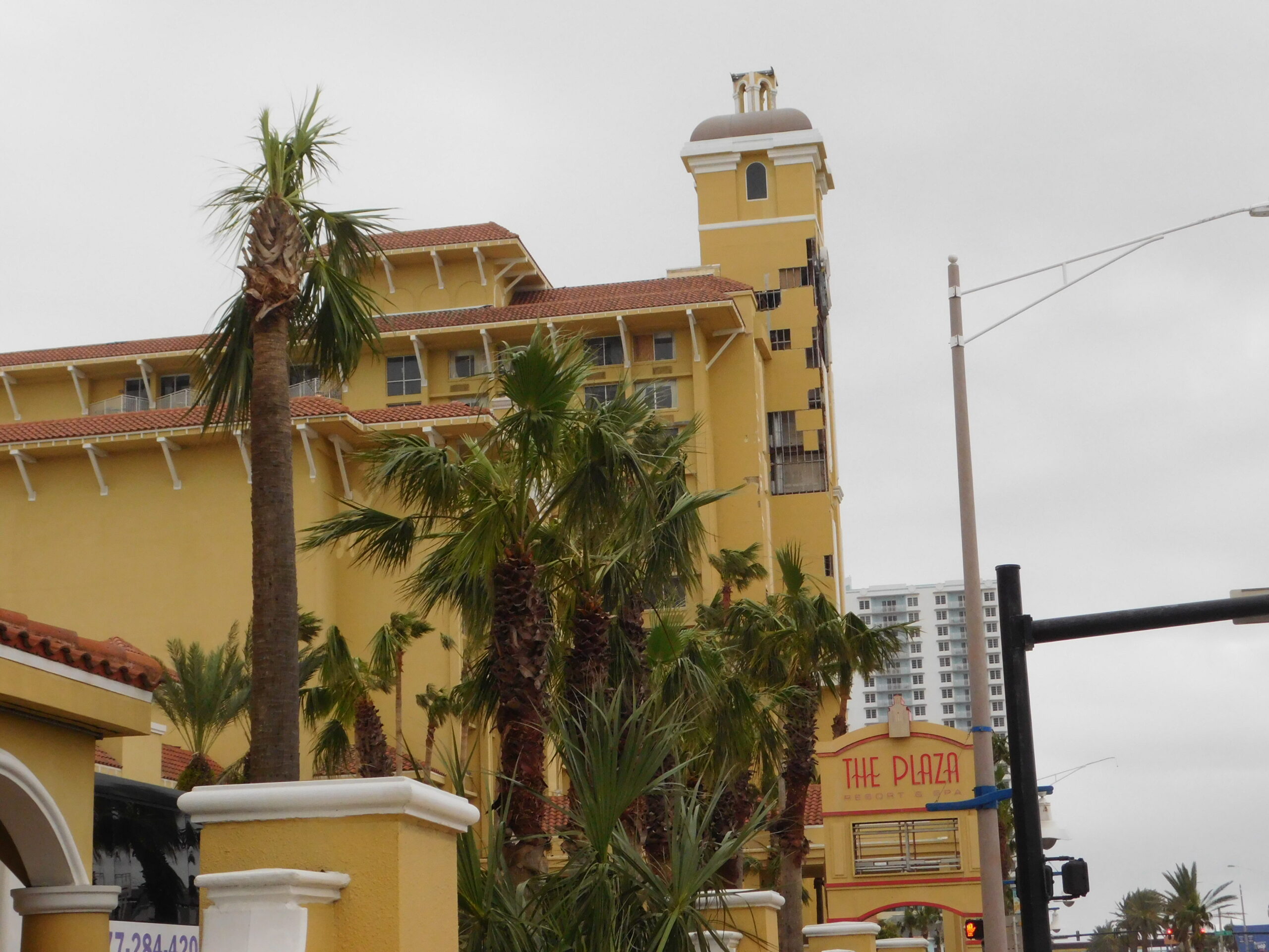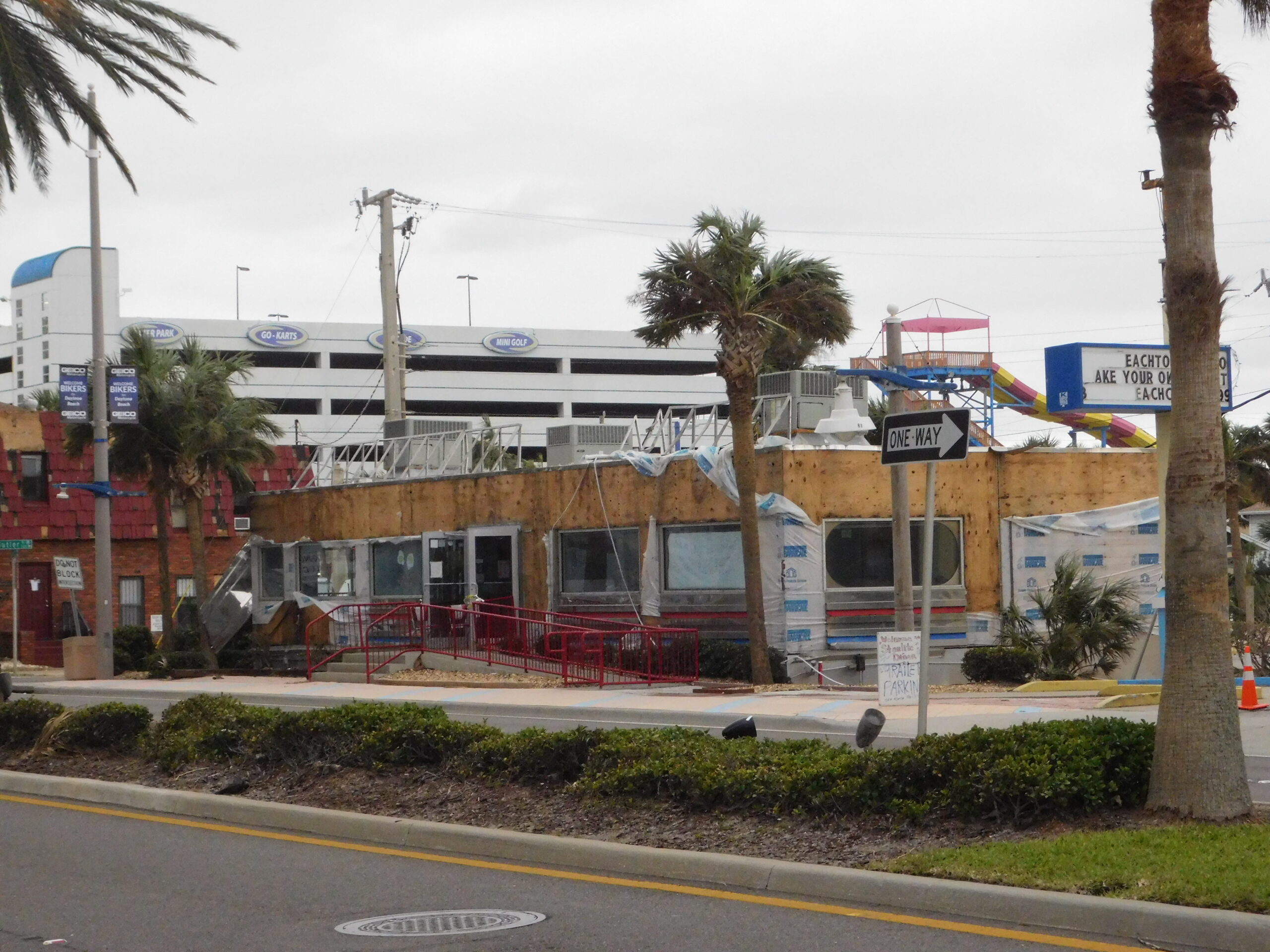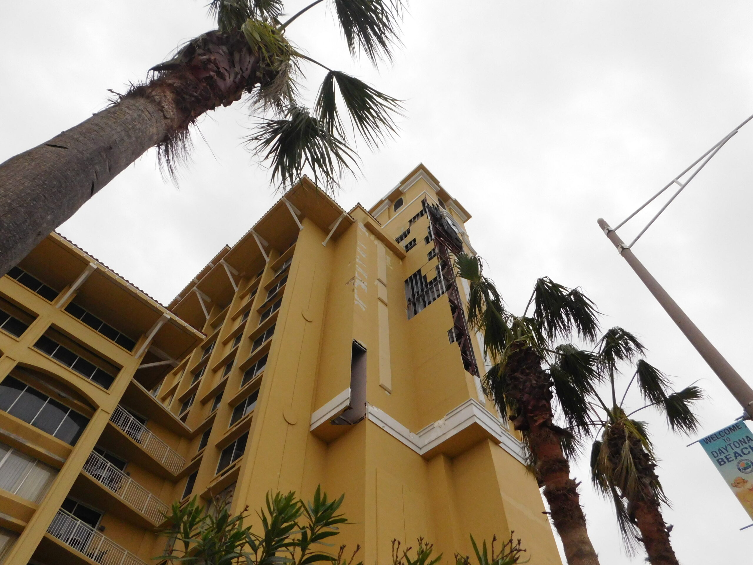 Daytona Beach just after Hurricane Matthew, October 13, 2016. This first group of pictures is on A1A and the Hilton Hotel. The hotel I was originally booked in for the night, The Plaza, didn’t are too well as you can see; in fact it looked a bit like The Tower of Terror in one picture. The Hilton didn’t fare any better, and was being vacuumed out floor by floor, and looks like they got a whole new set of furniture as well. Finally you can see the damage the tide surge did to the metal railings on the boardwalk. In the next group we’ll see how the Boardwalk itself fared…