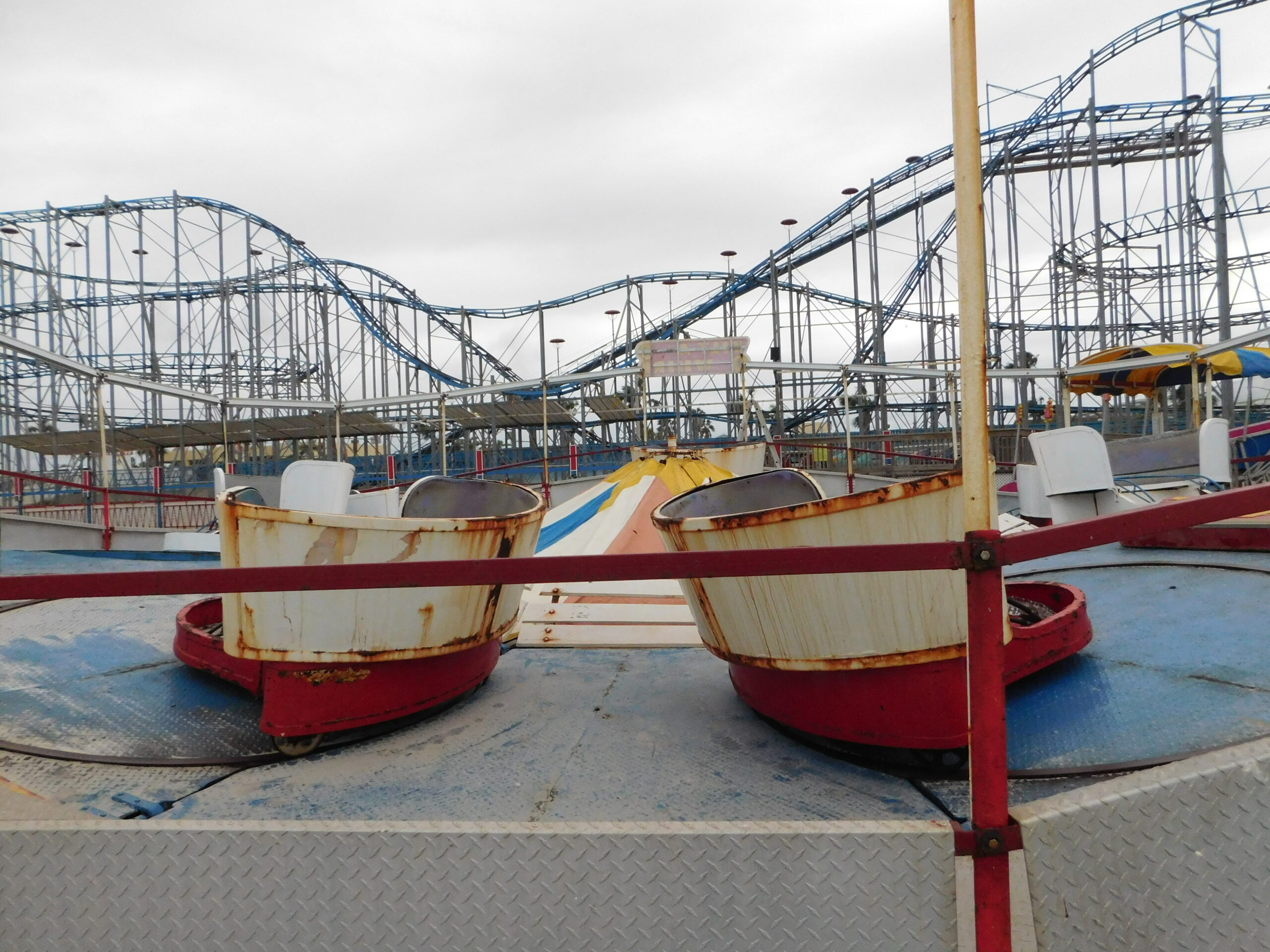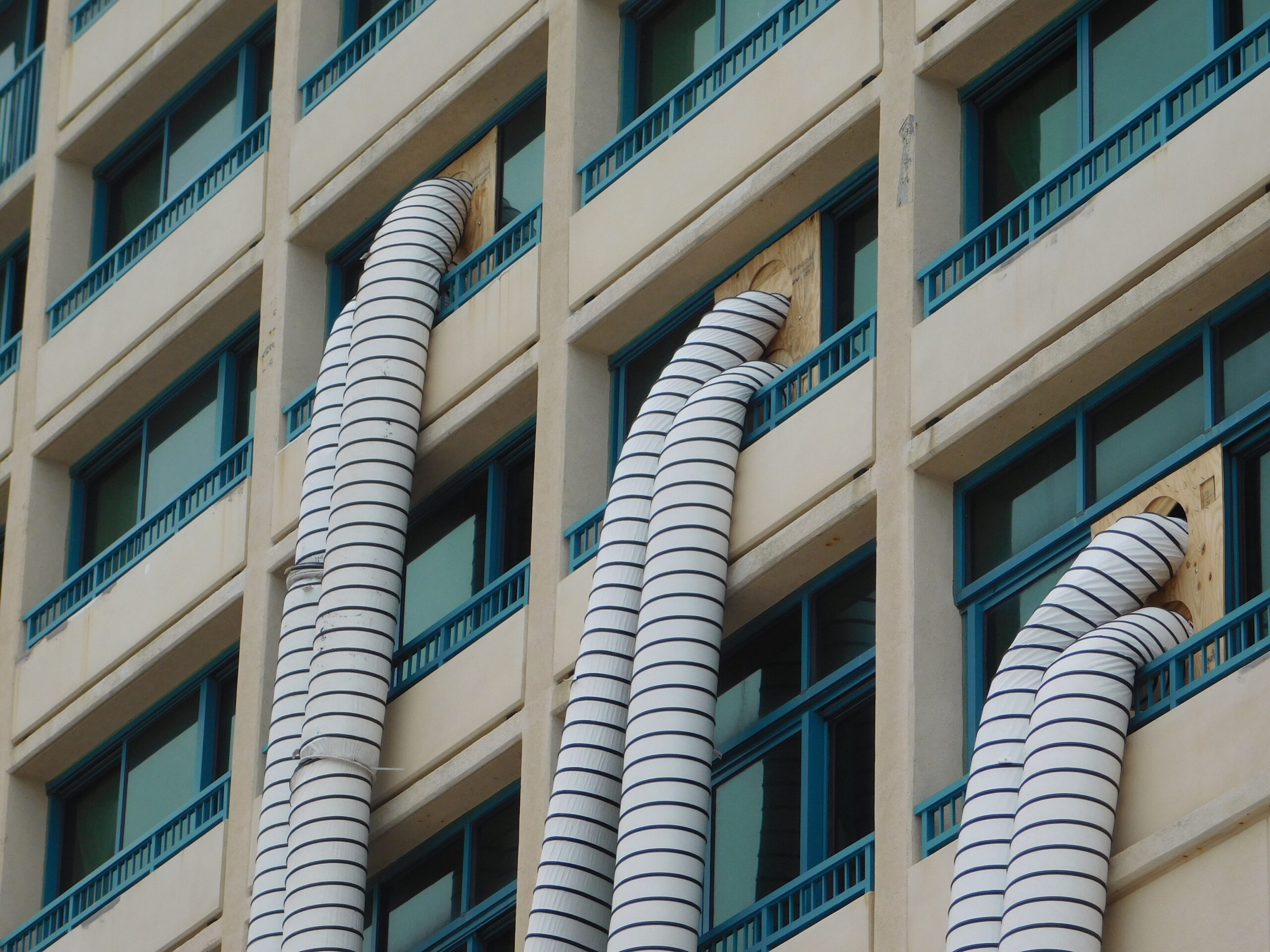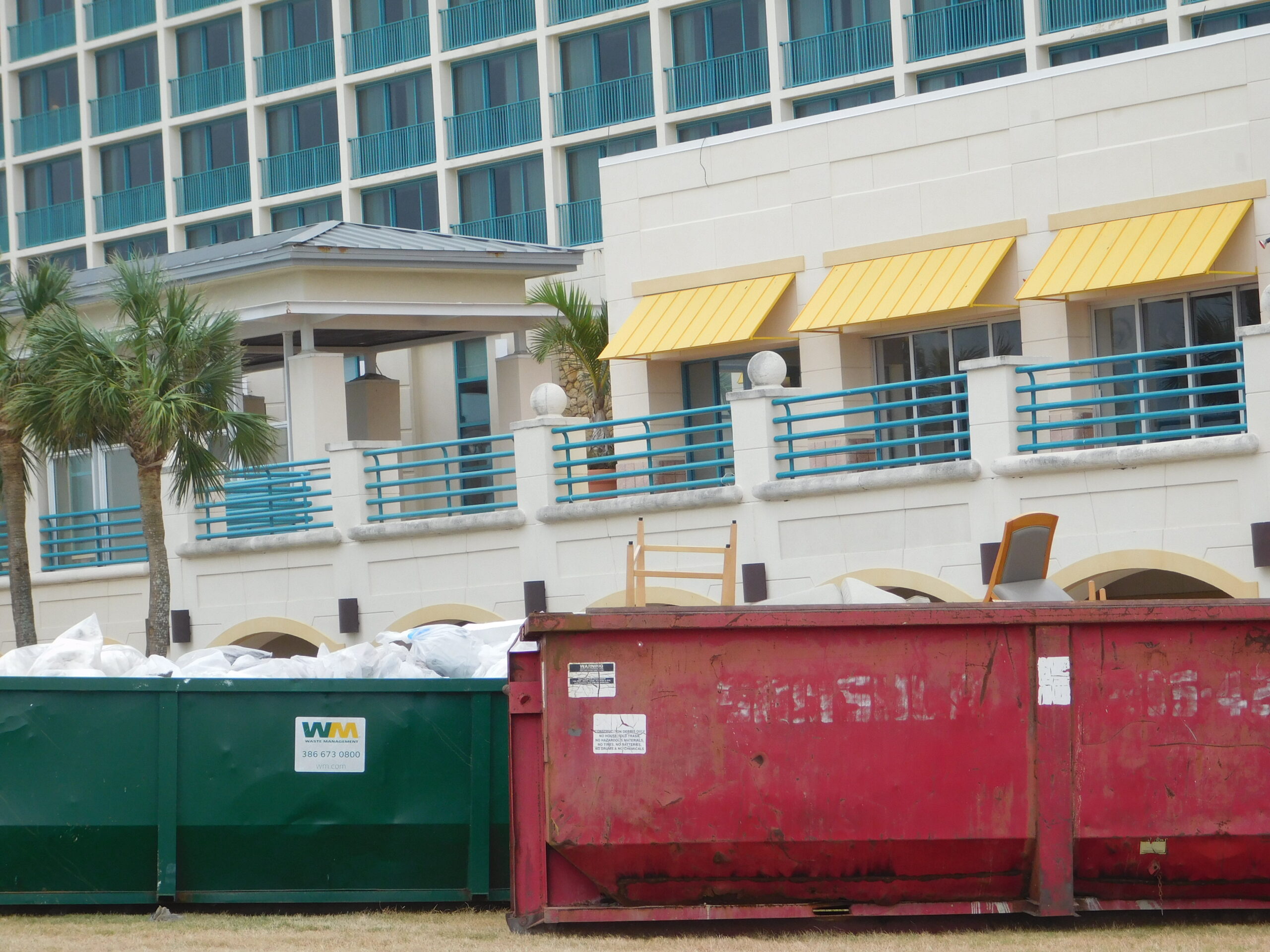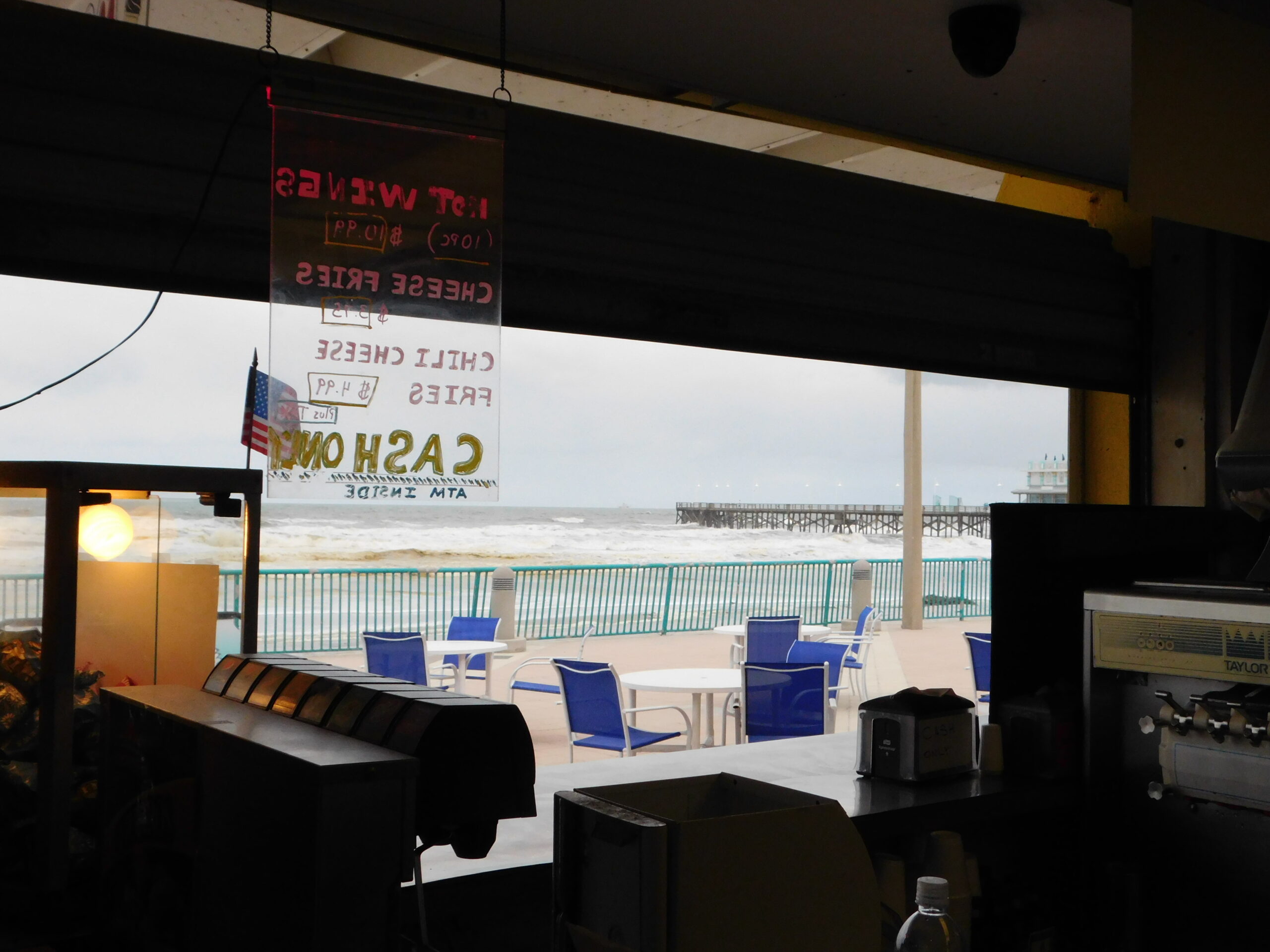 Daytona Beach just after Hurricane Matthew, October 13, 2016. This first group of pictures is on A1A and the Hilton Hotel. The hotel I was originally booked in for the night, The Plaza, didn’t are too well as you can see; in fact it looked a bit like The Tower of Terror in one picture. The Hilton didn’t fare any better, and was being vacuumed out floor by floor, and looks like they got a whole new set of furniture as well. Finally you can see the damage the tide surge did to the metal railings on the boardwalk. In the next group we’ll see how the Boardwalk itself fared…